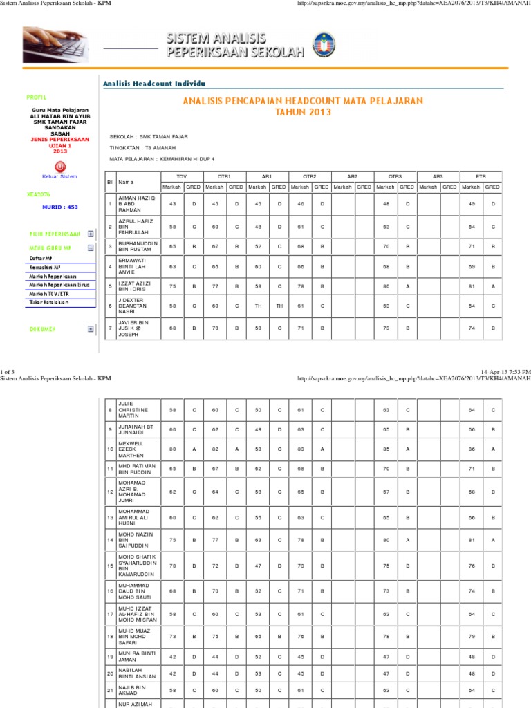Download View Sistem Analisis Peperiksaan Sekolah - Kpmpdf as PDF for free. SAPS memudahkan guru dan juga ibu bapa untuk memasukkan markah peperiksaan dan melihat prestasi pelajar di dalam peperiksaan. Once you are in there click on the relevant exam term that you want to check.